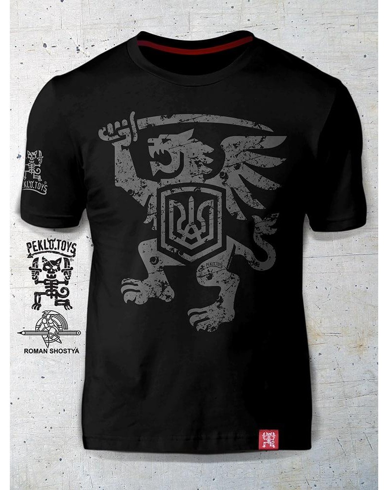 Крилатий лев є неофіційним Символом Українського війська і символізує незламний дух Українського Воїна! Основа - оригінальна футболка власного виробництва peklo.toys . Склад тканини: 95%-бавовна 5%-еластан . Колір- Брутально Чорний. На спині футболки зображена мініатюрна копія зображеного на грудях принта "Крилатий лев".